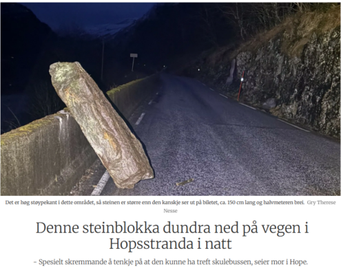 Denne steinblokka dundra ned på vegen i Hopsstranda i natt